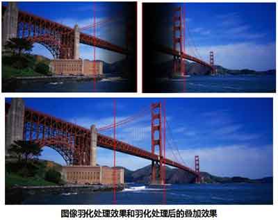 融合帶的羽化處理是將兩個投影機投射畫面的重疊部分,分別做圖像強度的連續而非線性變化,讓兩個投影機投射的畫面重疊部分圖像強度與融合帶兩側沒有經過重疊部分的圖像強度相一致, 產生色彩一致的融合畫面。